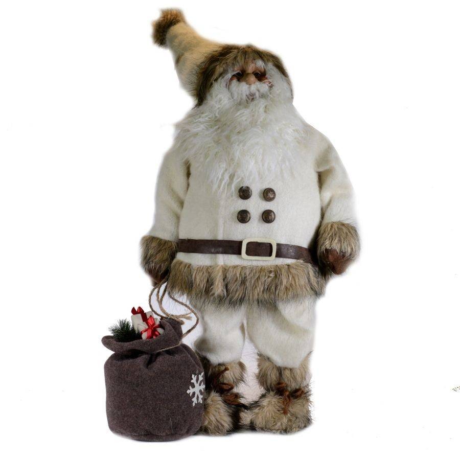 Con vestito bianco e beige e sacco di doni.