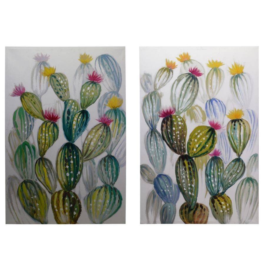 Per dare un tocco di freschezza alla stanza, senza rinunciare all’eleganza e al buon gusto, ti proponiamo questo set di due quadri dipinti che raffigurano dei cactus in fiore.