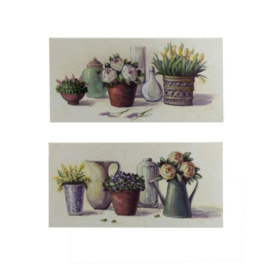 Il set di 2 quadri in legno di Vacchetti, si adatta ad ogni stile e personalità, ogni quadro ha un motivo diverso con vasi e fiori.