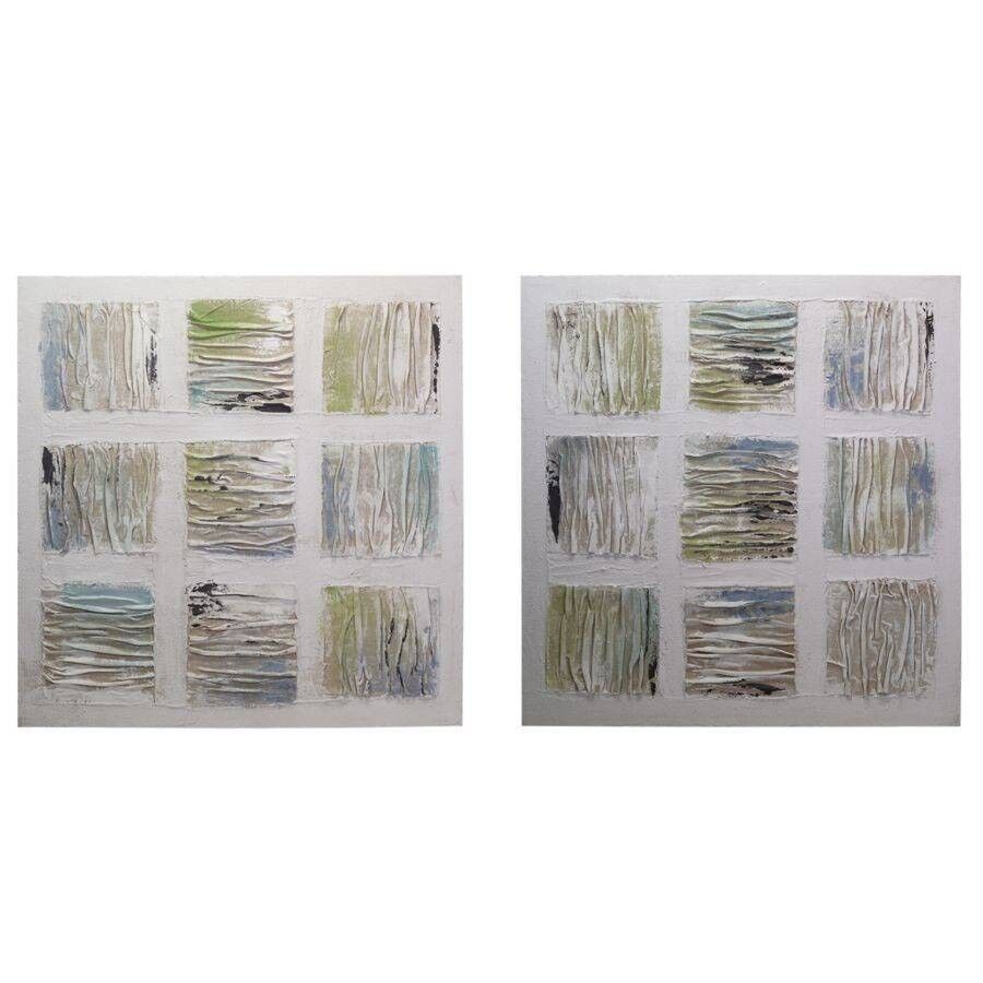 Per questo proponiamo un set di due quadri di forma quadrata dipinti con una fantasia astratta e moderna, con dei riquadri dipinti sui toni del blu, grigio e verde.