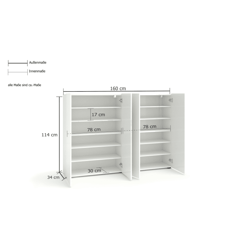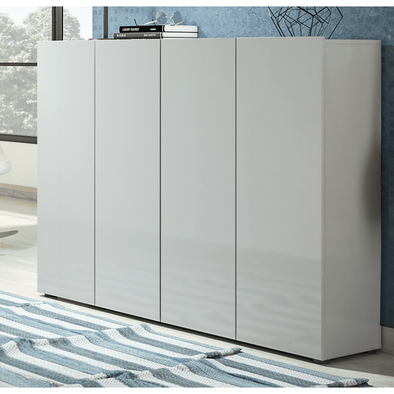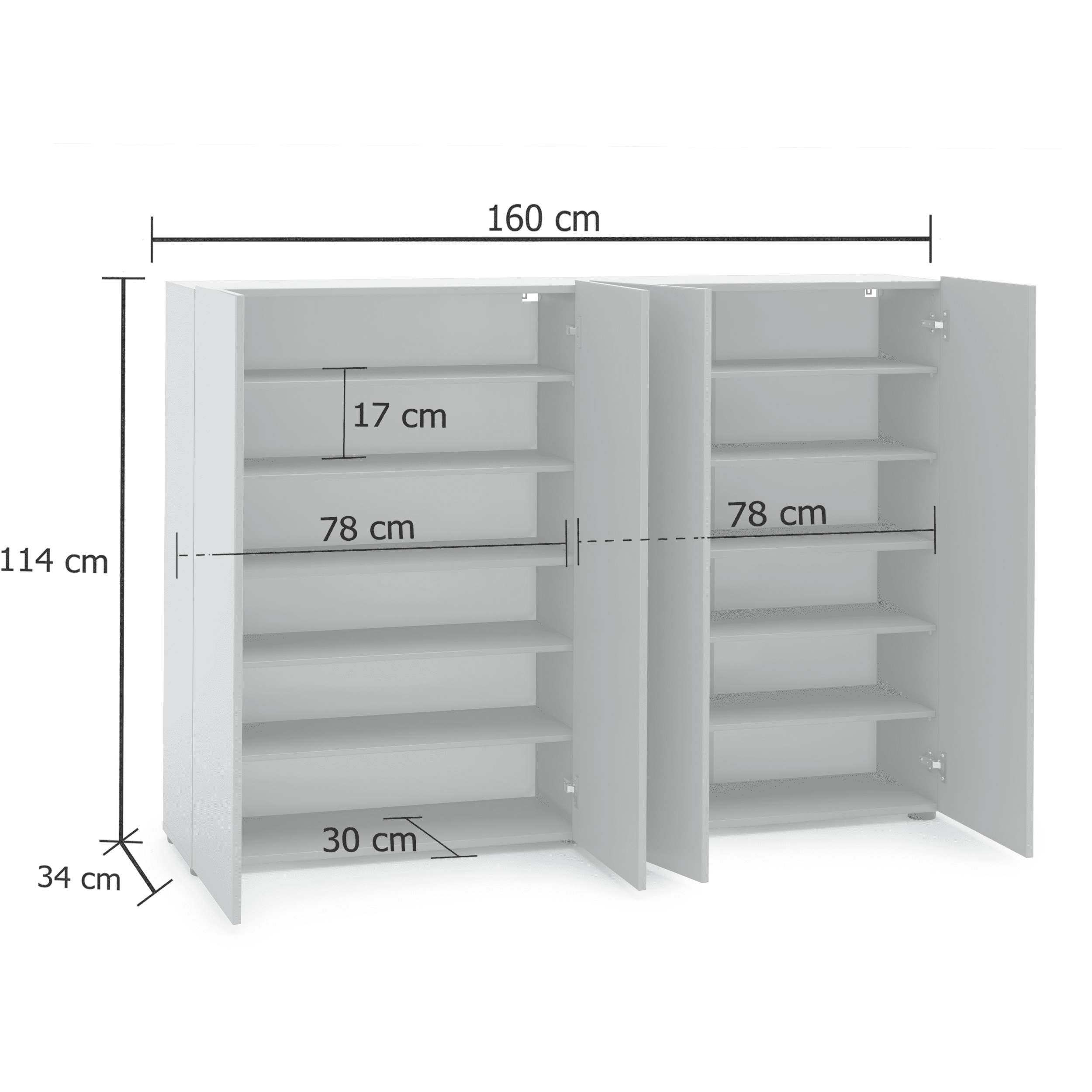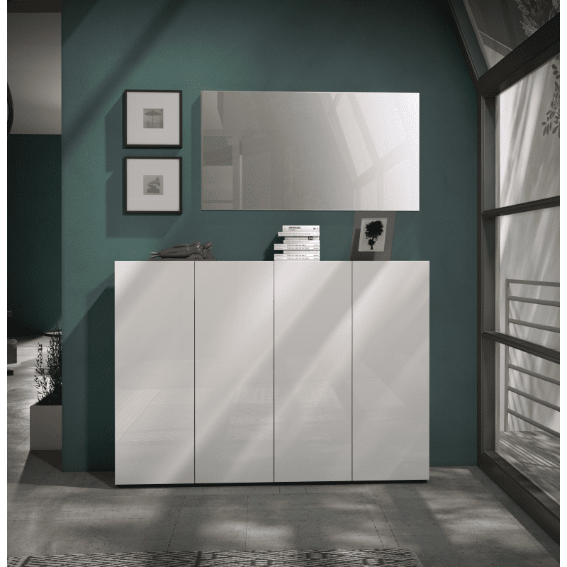 La versione bianca della scarpiera aggiunge un tocco di freschezza e modernità alla stanza, creando un punto luce ideale. Con una lunghezza di 160 cm e 4 ante, offre ampio spazio per organizzare le scarpe in modo ordinato e accessibile.
