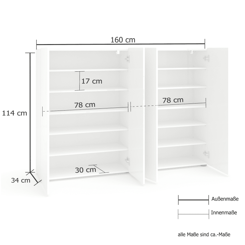 I 10 ripiani interni, con un totale di 12 piani d’appoggio, consentono di custodire una vasta collezione di scarpe in modo efficiente. Realizzata in bianco lucido, questa scarpiera aggiunge un tocco classico e raffinato all’ambiente circostante, garantendo allo stesso tempo un’elevata funzionalità.