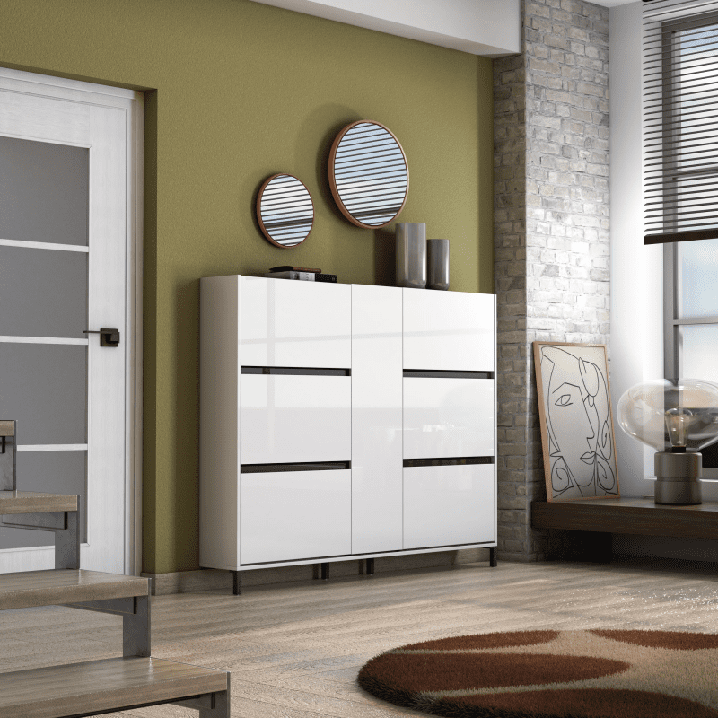 La scarpiera bassa Kitaly – Easy unisce eleganza e praticità con una silhouette geometrica e un’apertura senza maniglie, per un design moderno e pulito. Il raffinato colore antracite crea un contrasto sofisticato con lo sfondo chiaro, dando al mobile un’eleganza senza tempo. Perfetta per spazi contenuti come corridoi, ripostigli o lavanderie, questa scarpiera salvaspazio è dotata di 6 ante a ribalta e un’anta centrale, per un totale di 3 vani interni, offrendo ampio spazio per le tue scarpe. La struttura laccata bianco lucido, con dettagli antracite, aggiunge un tocco di modernità e raffinatezza alla tua zona ingresso, unendo funzionalità e stile.