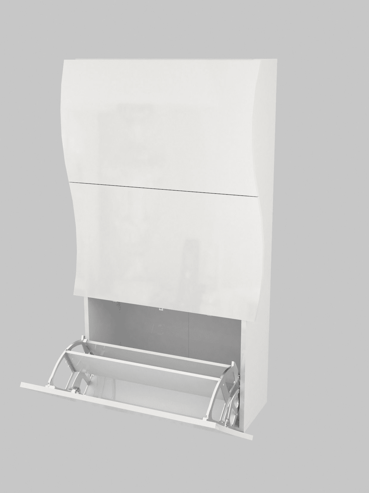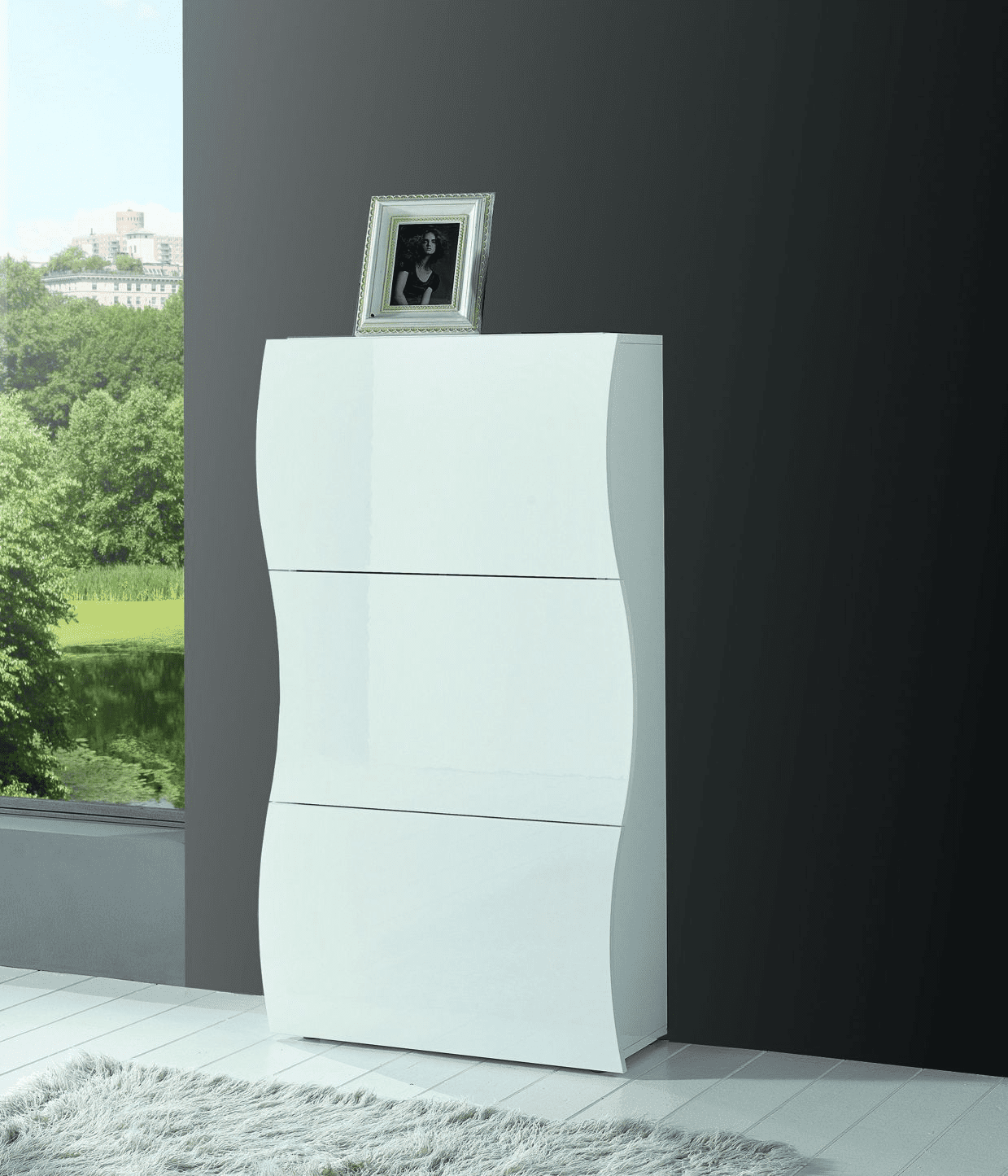 È dotata di tre ante a ribalta e può contenere fino a 18 paia di scarpe. La struttura e le ante sono in melaminico laccato bianco lucido.