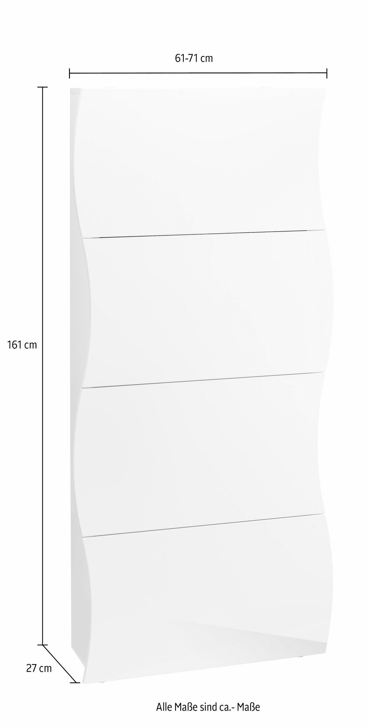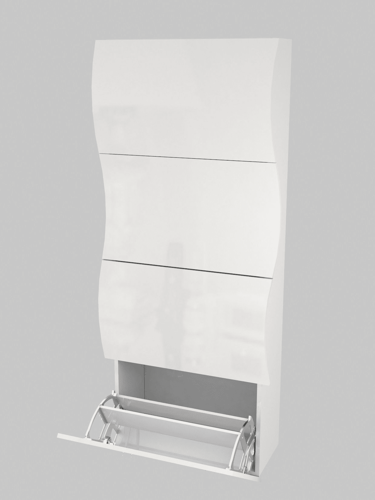È dotata di quattro ante a ribalta e può contenere fino a 24 paia di scarpe.