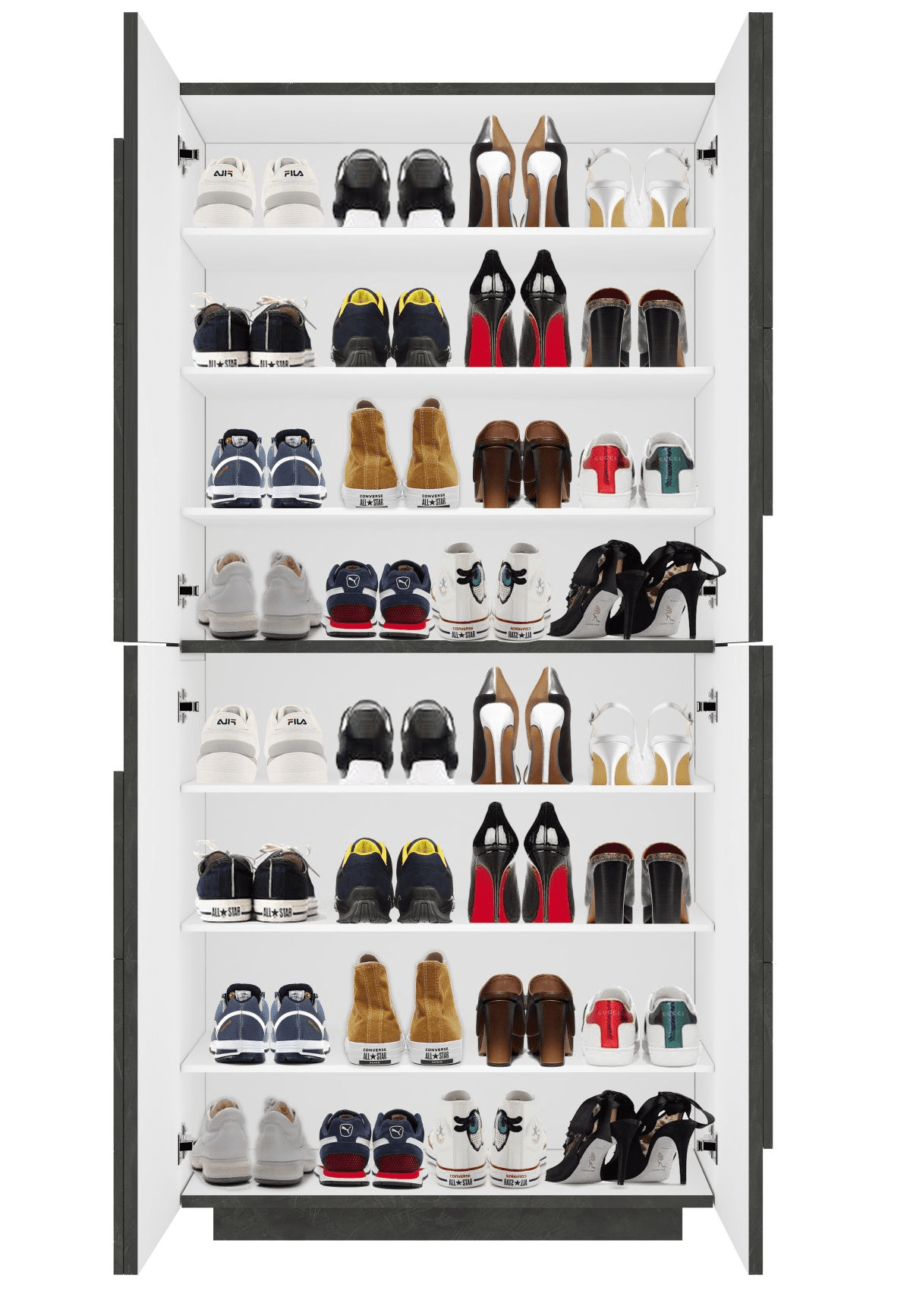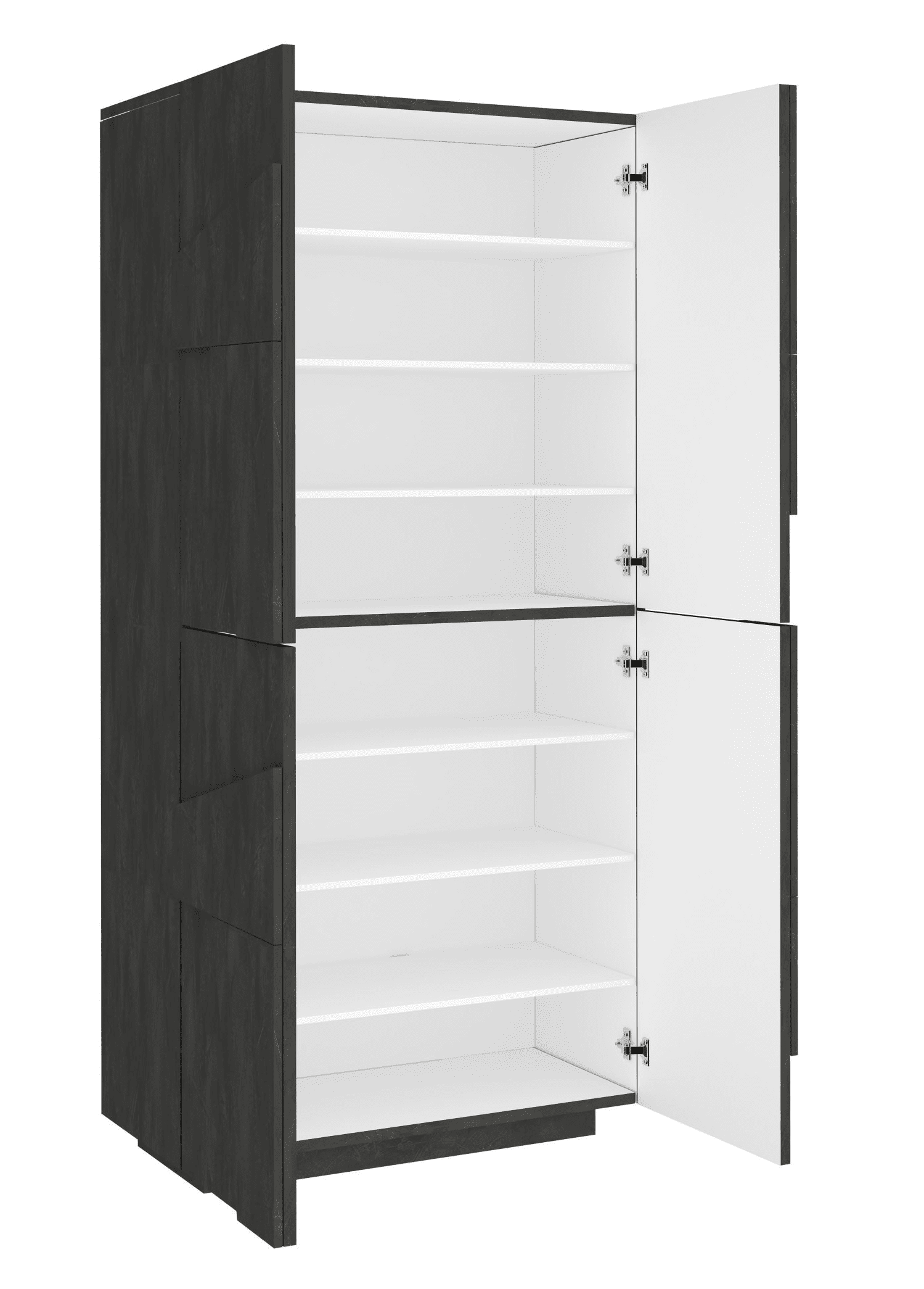 È dotata di 4 ante battenti rese particolari da un motivo geometrico in rilievo sulla superficie che rendono la scarpiera del tutto moderna.