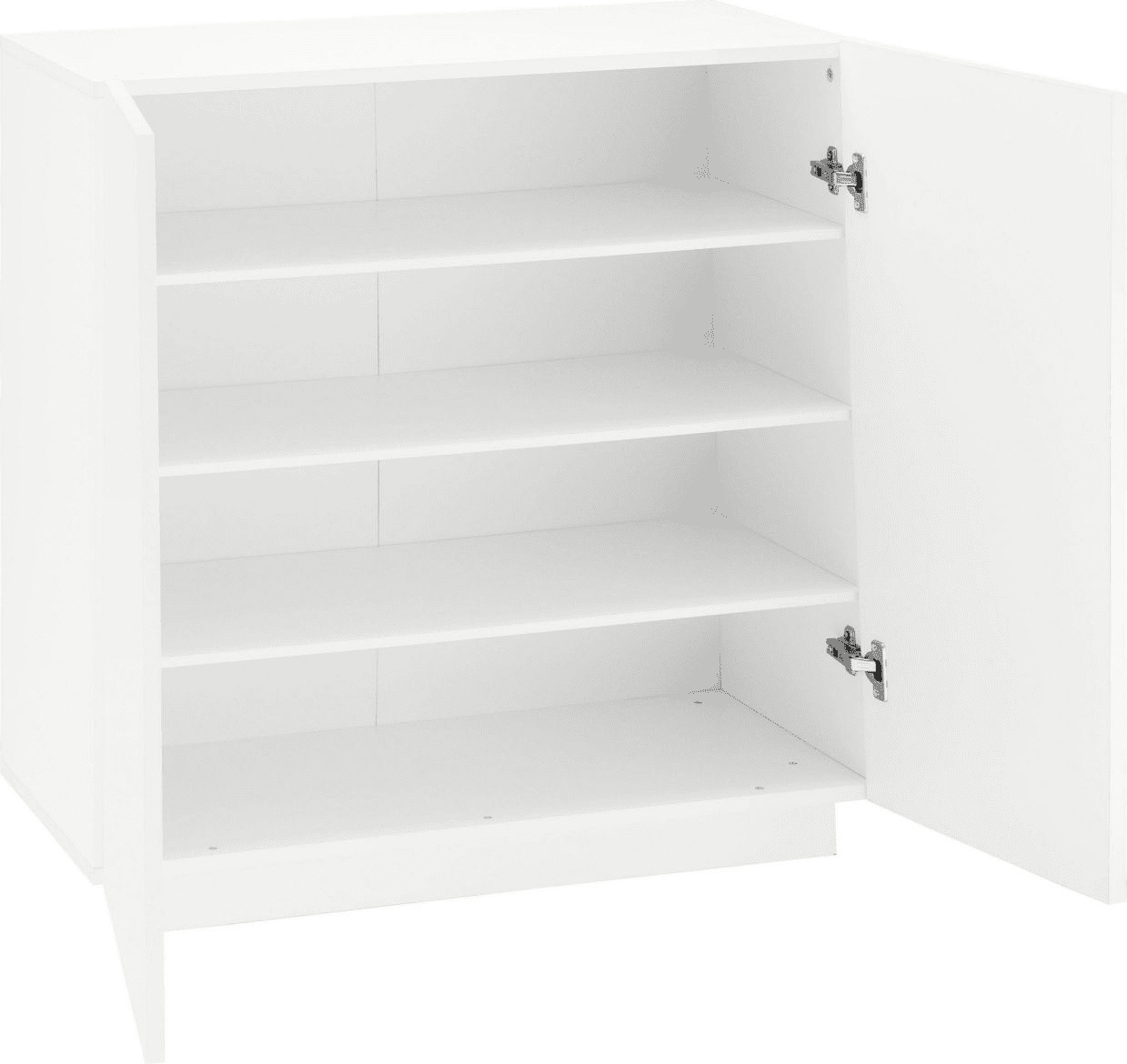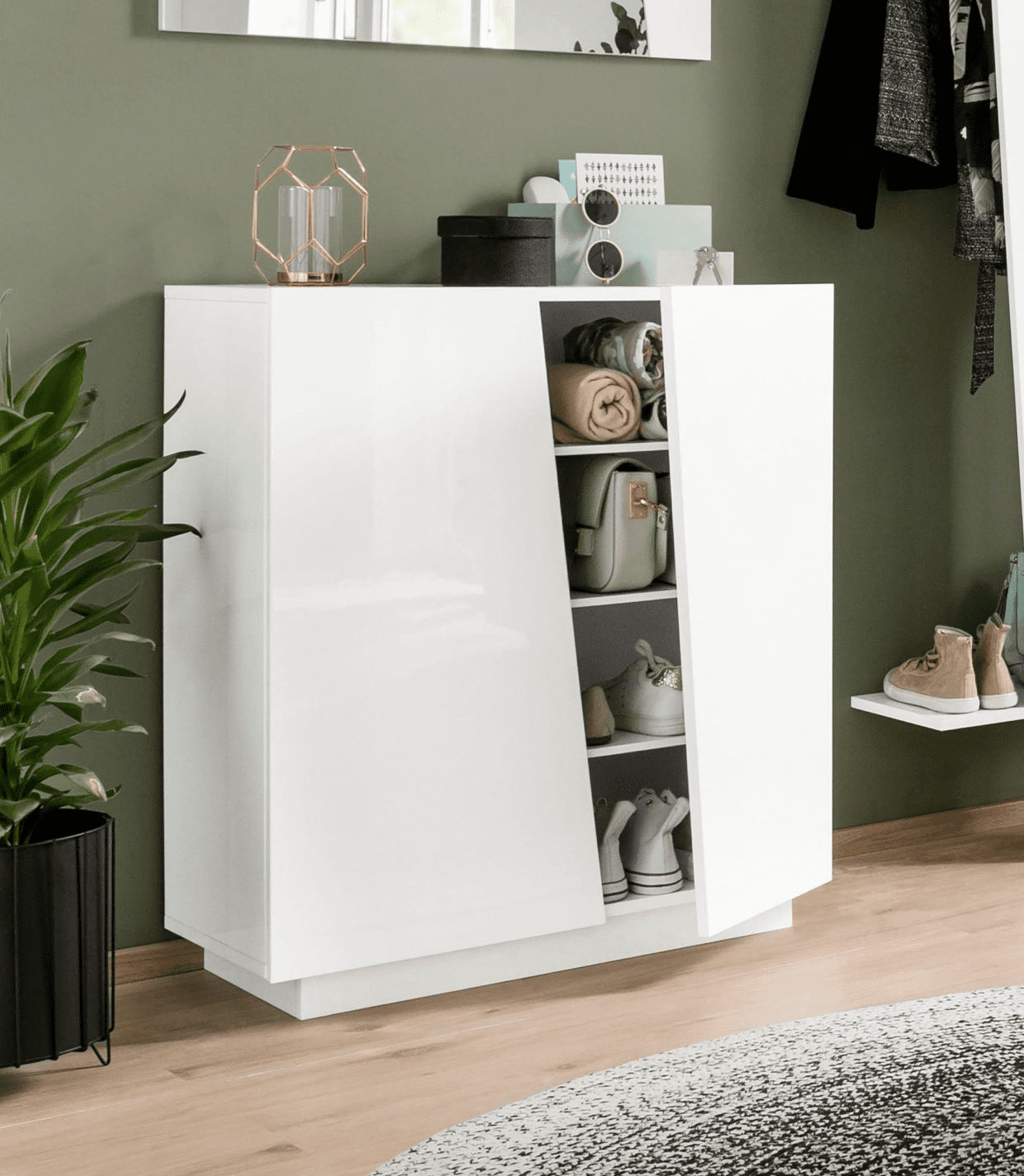 Può contenere fino 16 paia di scarpe. La struttura e le ante sono in melaminico bianco lucido.