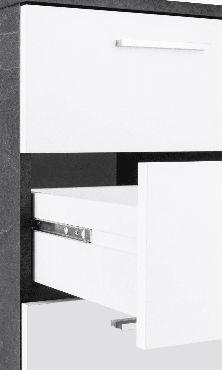 La struttura e i cassetti sono in melaminico colore bianco e color report, i frontali sono in melaminico colore bianco lucido e report,.