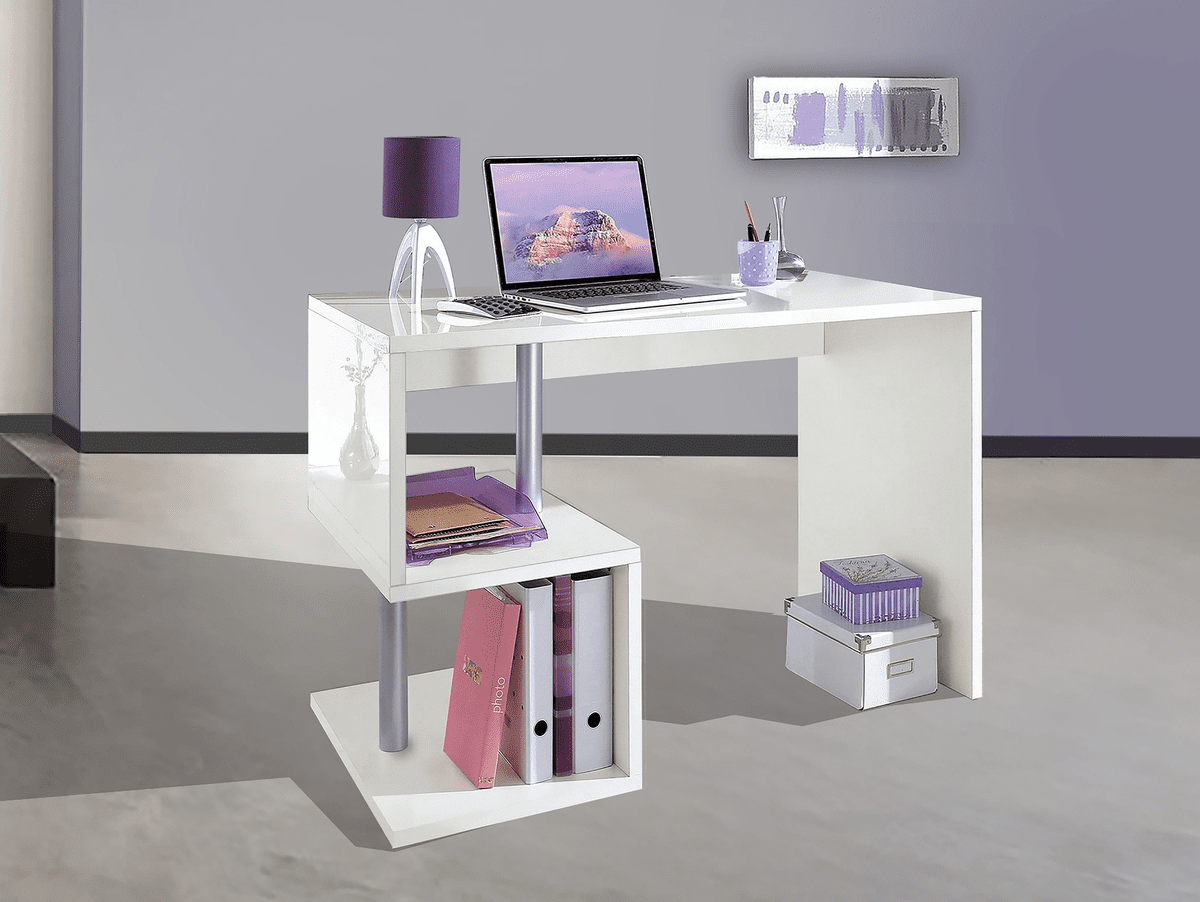 La scrivania ha un design innovativo. È priva di cassetti che sono sostituiti da una gamba a forma di esse che crea due comodi piani a giorno per raccogliere oggetti e documenti per il lavoro.