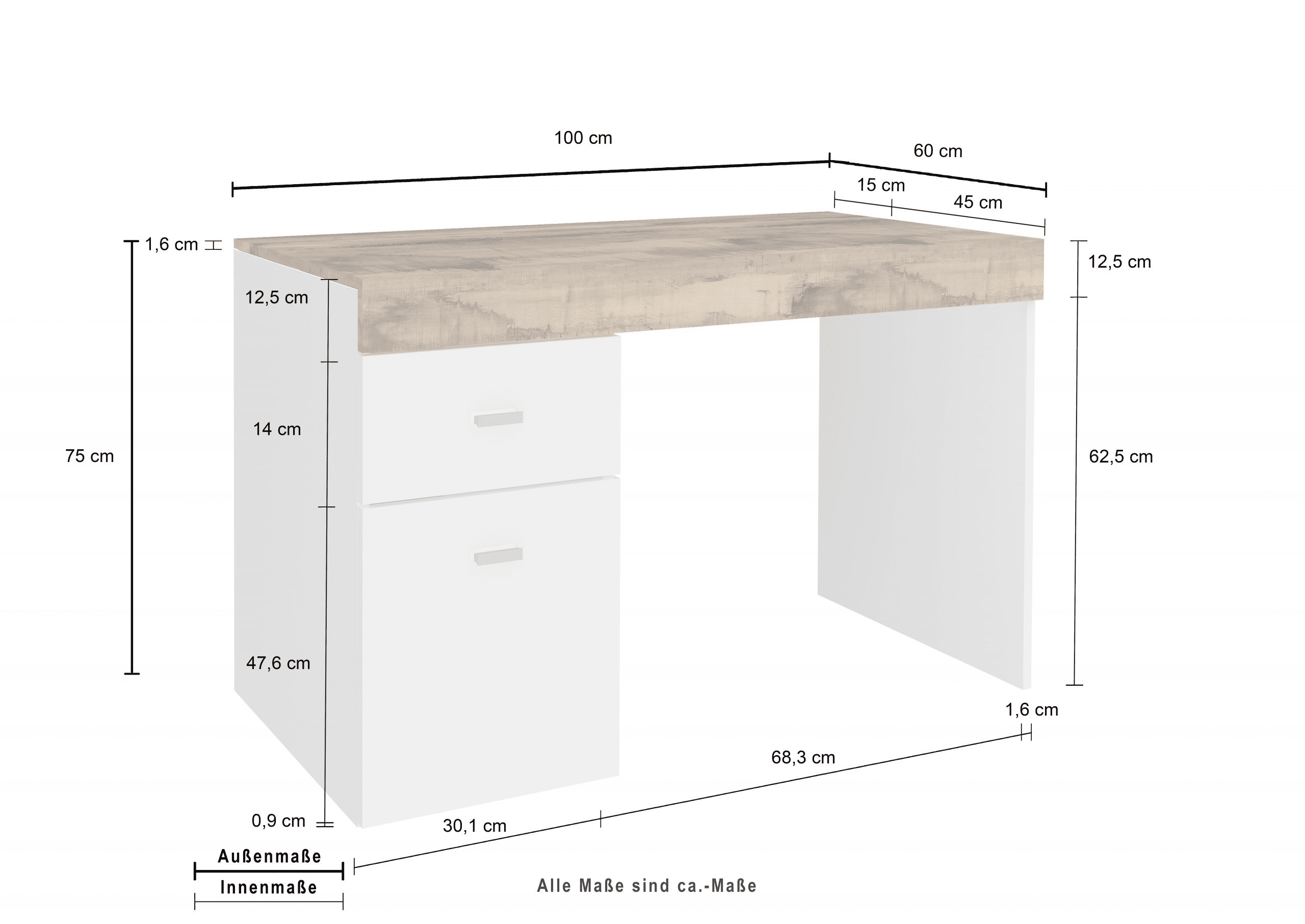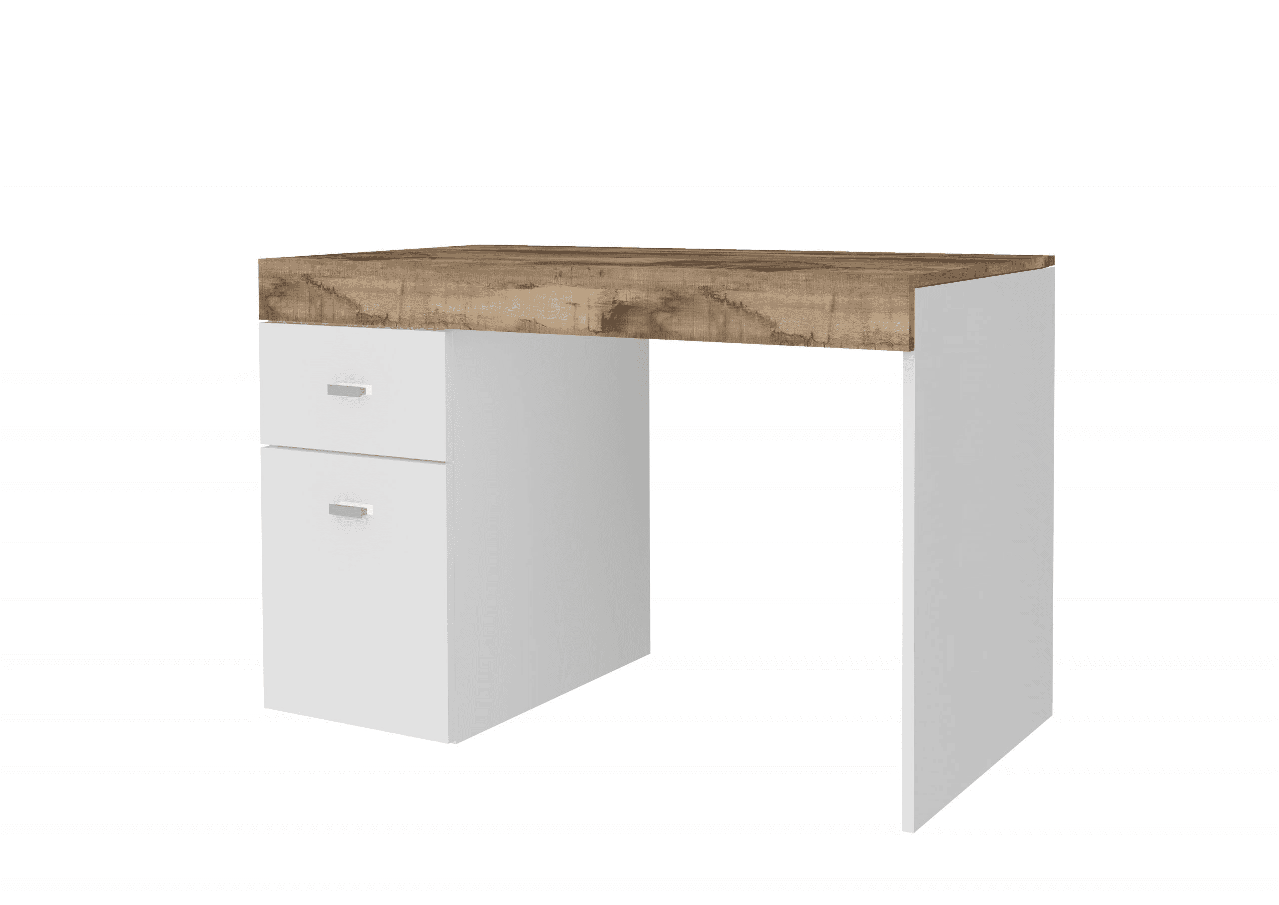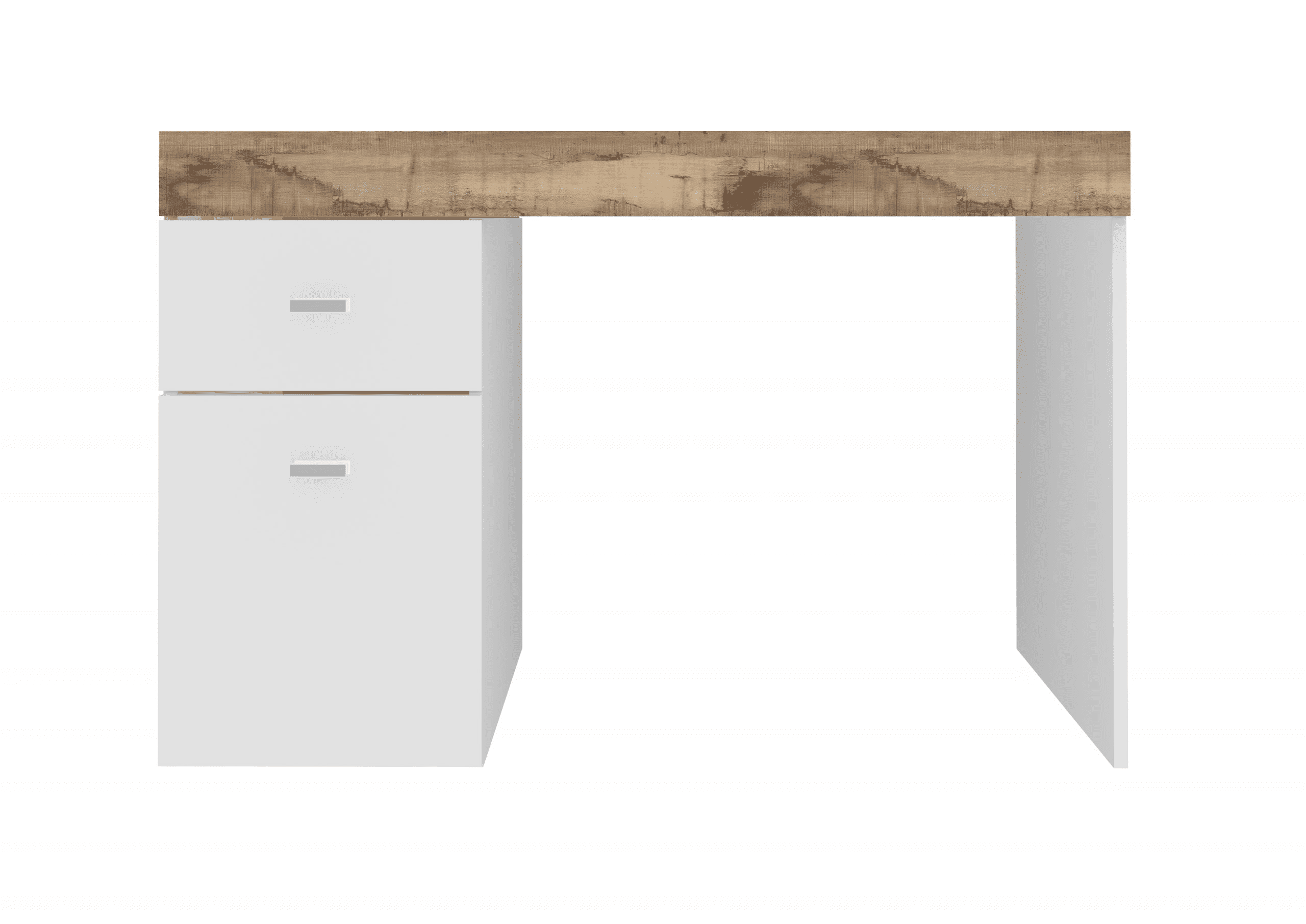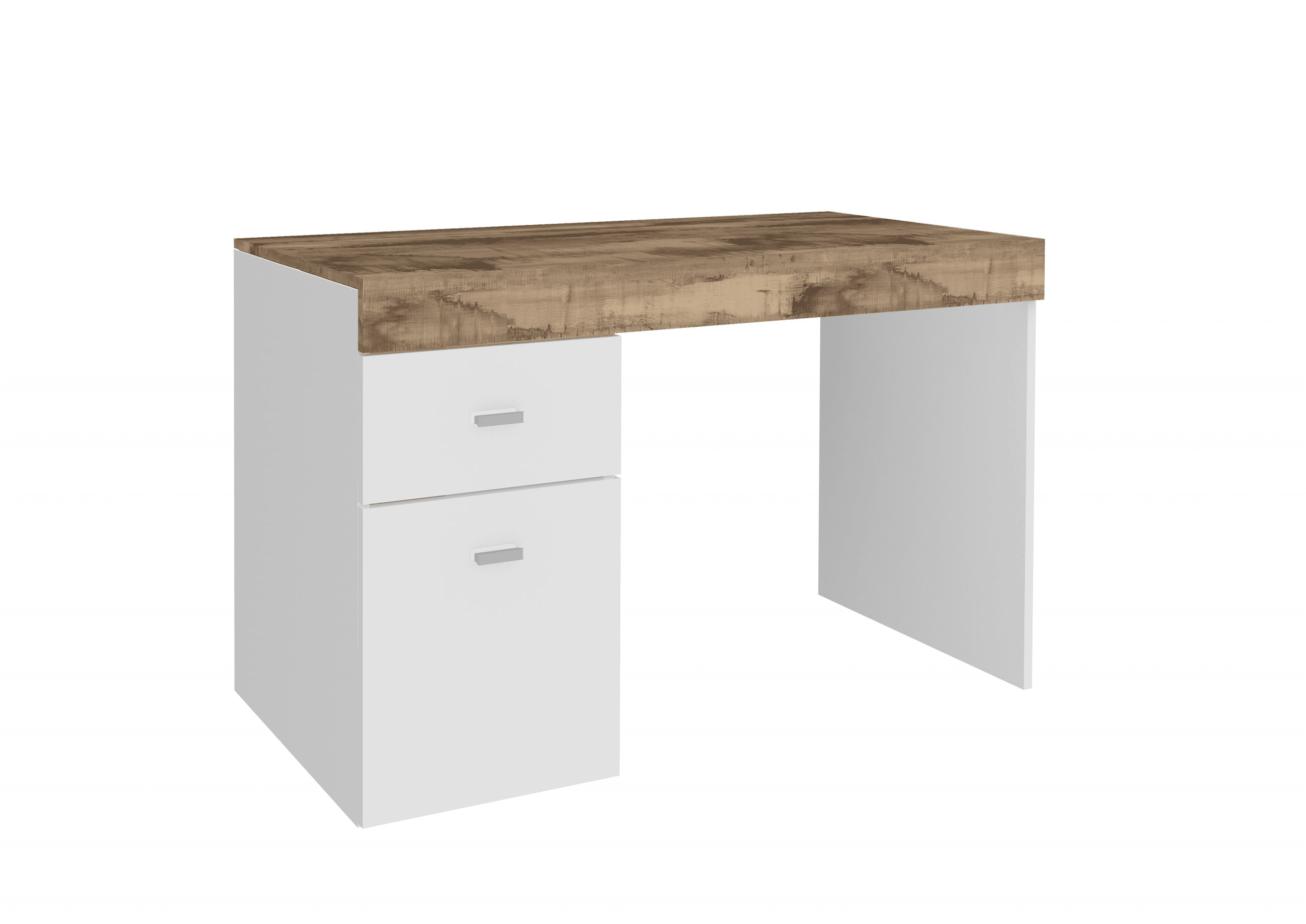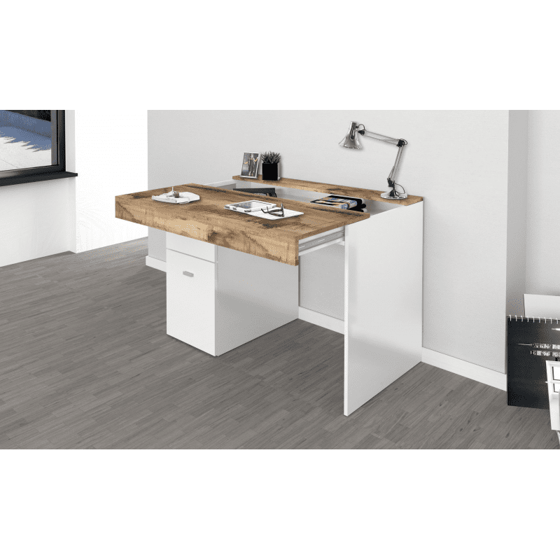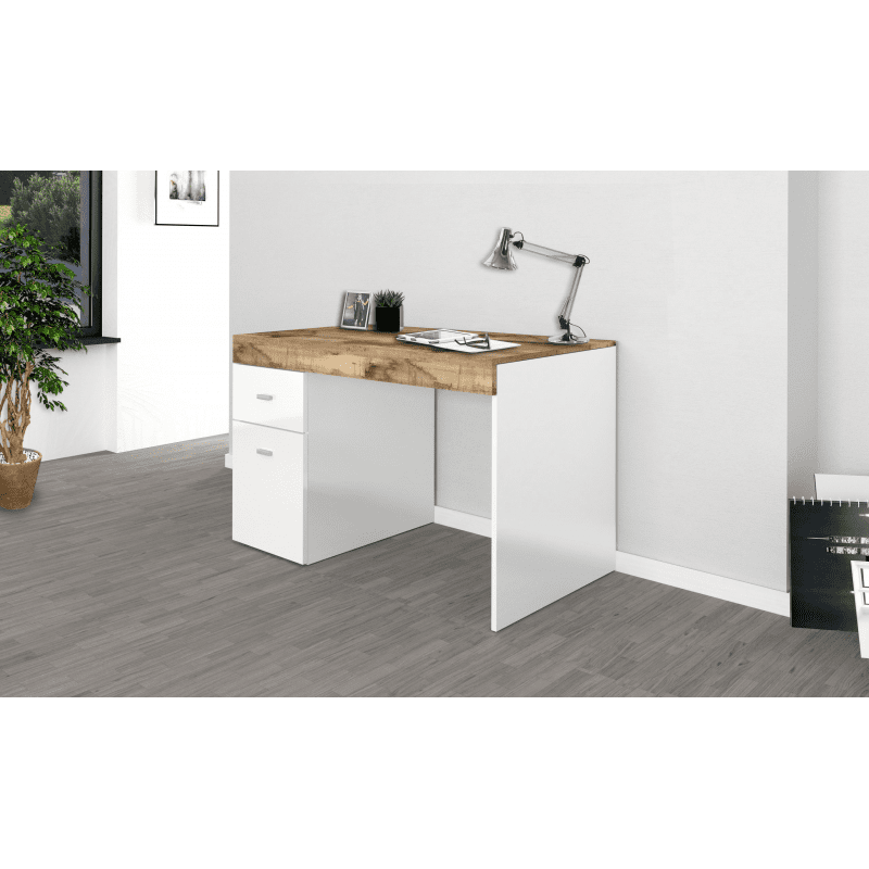 La scrivania si distingue per il suo design moderno e la sua elevata funzionalità, pratica e comoda, la struttura e il piano sono in melaminico di colore bianco laccato lucido e il piano in melaminico di colore acero pereira e certificate FSC.