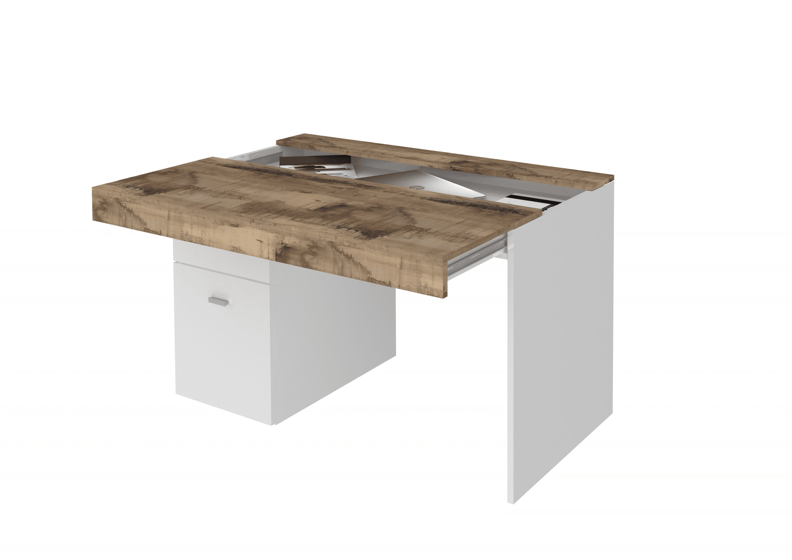 La scrivania è formata da una piana scorrevole in folding a L dove al suo interno abbiamo creato uno spazio per archiviare documenti, laptop, iPad…