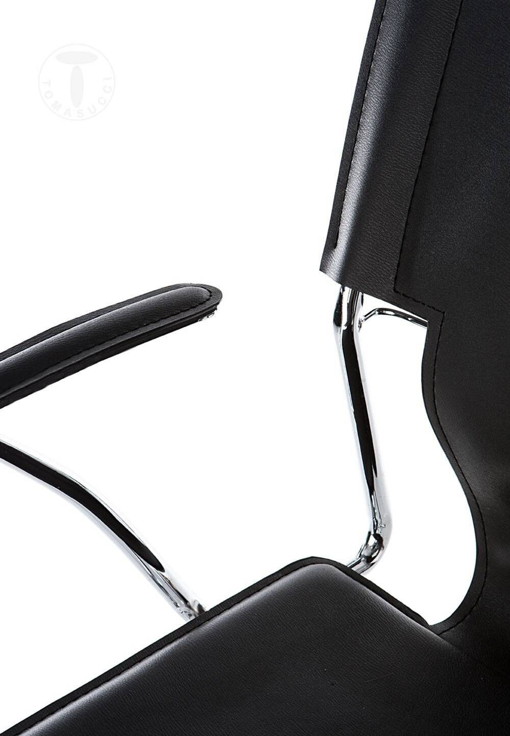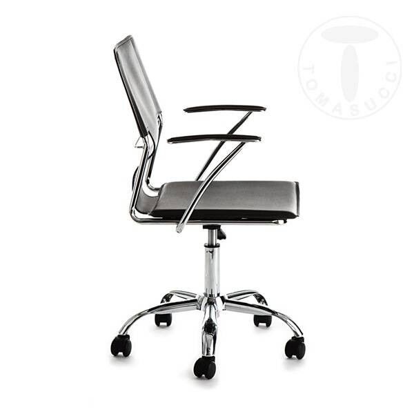 La base è a stella in metallo cromato con alzata a gas regolabile in altezza, la seduta è in pelle ecologica nera.