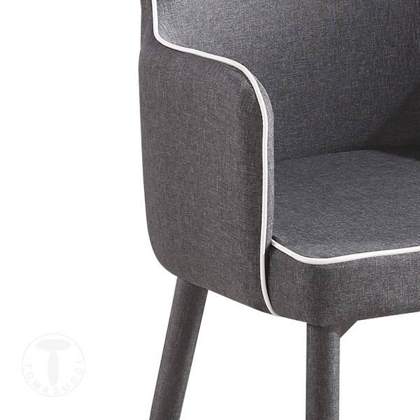 La sedia è completamente rivestita in tessuto grigio, con un elegante bordino bianco che corre lungo tutto il profilo e che dona un tocco di fascino in più. Facile da inserire in ambienti moderni grazie ai colori, ma anche in stanze più classiche grazie alla sua forma armoniosa.