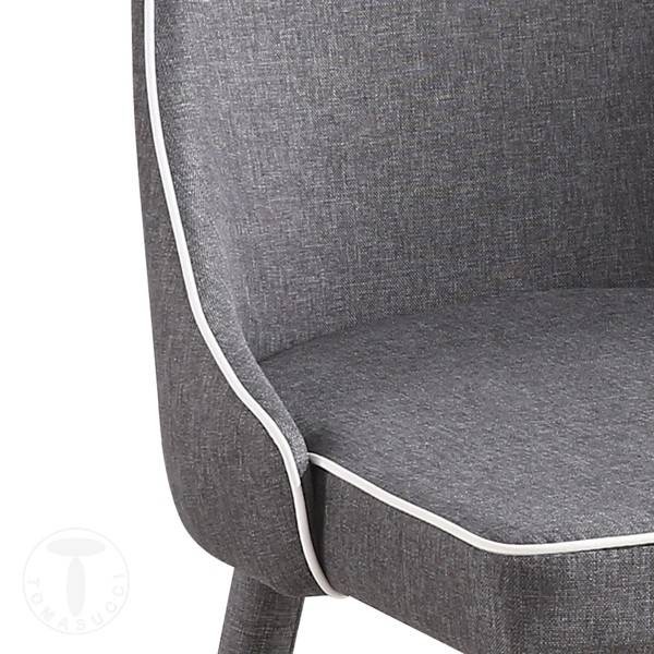 Ideale per un living moderno o per una sala da pranzo importante, questa sedia ha una struttura in metallo verniciato ed è completamente rivestita in tessuto grigio, con la particolarità di un bordino bianco a contrasto intorno a tutta la seduta e sullo schienale.