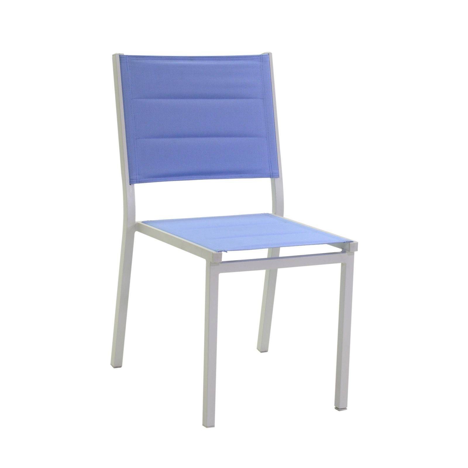 La sedia Ontario ha una struttura solida e resistente, in alluminio verniciato a polvere di colore bianco e, per dare il massimo comfort, una morbida seduta e un comodo schienale in textilene azzurro imbottito in spugna.