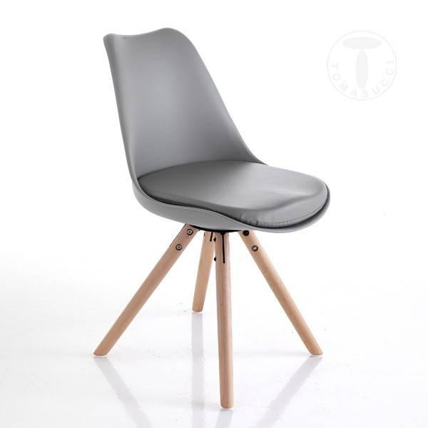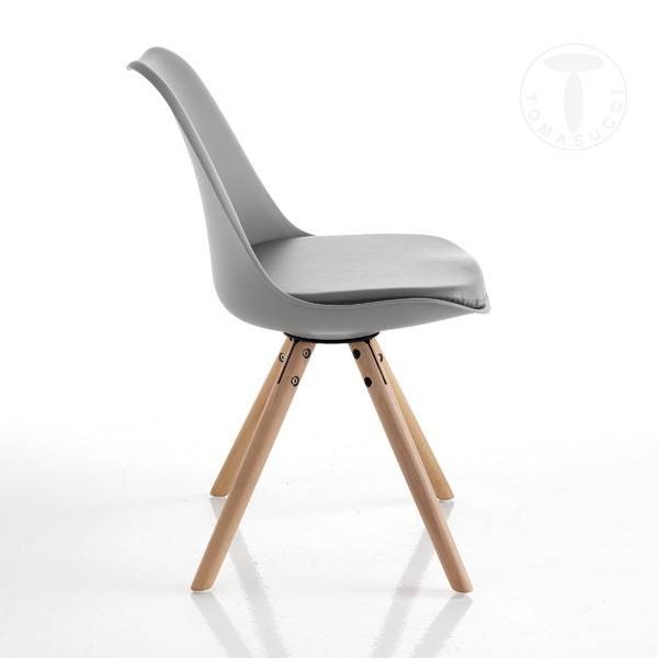 La forma è essenziale ma elegante, con scocca in polipropilene opaco di colore grigio, reso più comodo da una seduta imbottita e rivestita in pelle sintetica. Le gambe sono in legno massello finitura rovere.