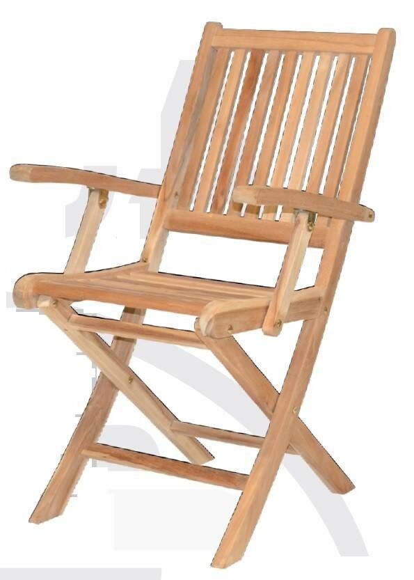 La sedia pieghevole con braccioli è in legno esotico (TEAK), con seduta e schienale a doghe verticali.