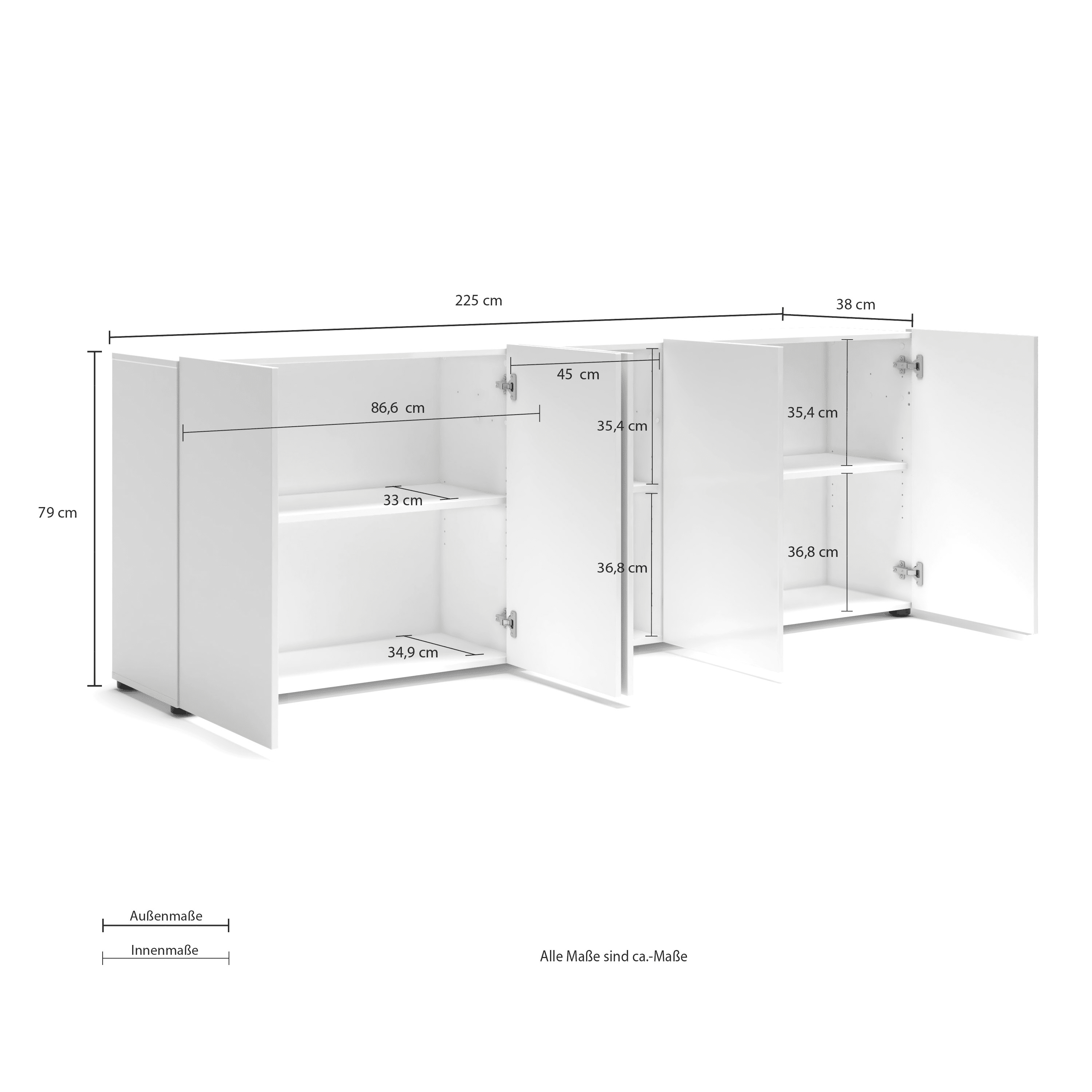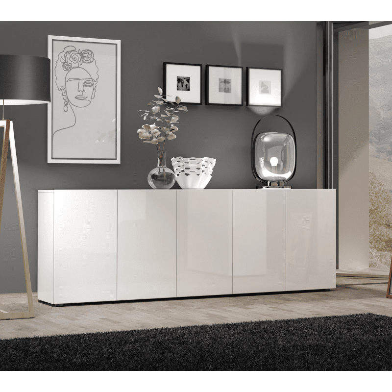 La madia a 5 ante della linea Mister è la soluzione ideale per chi cerca un mobile capiente e versatile. Con i suoi 225 cm di lunghezza e 5 ante, offre ampio spazio per organizzare accessori, utensili e oggetti da cucina o soggiorno. Dotata di 6 vani interni, ottimizza lo spazio per una gestione ordinata. Il design essenziale e il colore bianco lucido donano un tocco moderno e luminoso all’ambiente. Adatta a diversi stili di arredamento, è facile da pulire e perfetta per chi cerca un mobile funzionale, pratico e raffinato