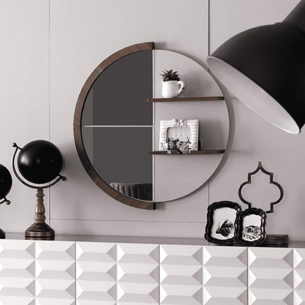 Specchiera rotonda caratterizzata dal vetro fumè e due mensole.