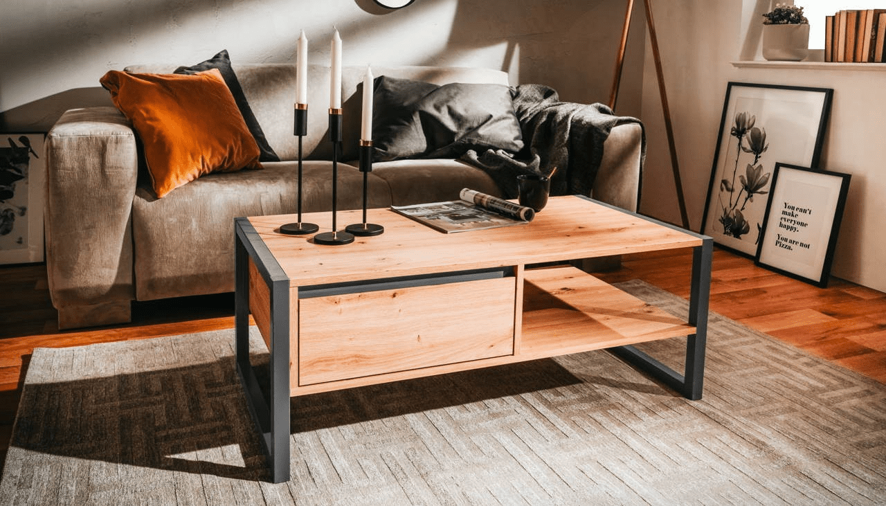 Il tavolino da salotto Denver 55 è composto da 1 cassetto e un vano a giorno. La scocca e il cassetto sono in finitura quercia, mentre i profili e i particolari sono colore antracite.