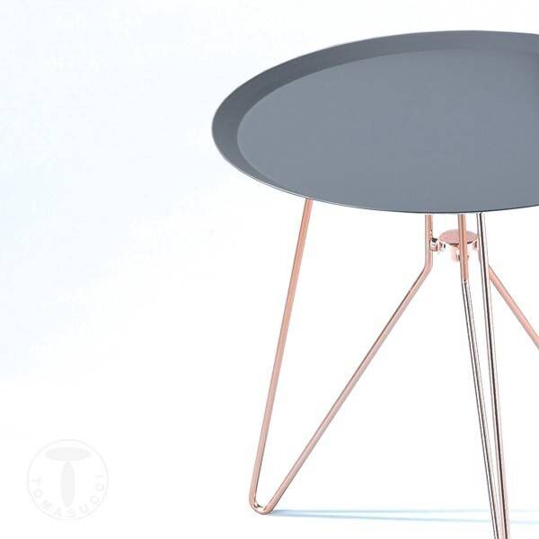 Lo stile di questi tavolini è moderno ma allo stesso tempo molto sofisticato: la struttura è in acciaio verniciato rame, la cui lucidità contrasta con il piano in acciaio verniciato antracite.