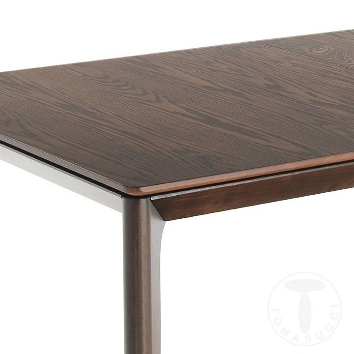 Il tavolo Varm ha gambe in legno massello, con finitura noce scuro e piano in MDF impiallacciato noce scuro, è dotato di due prolunghe che possono essere usate anche separatamente della lunghezza di 40 cm l’una.