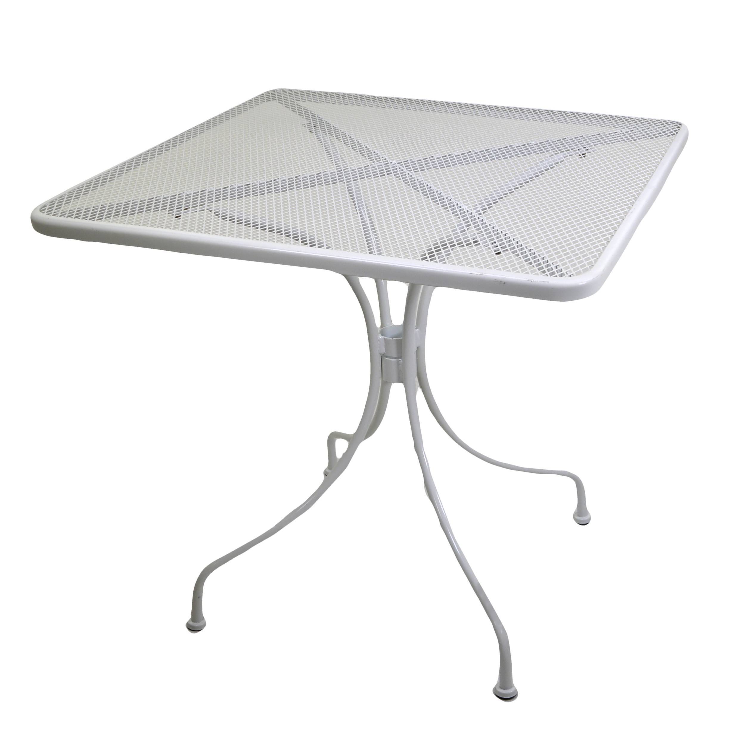 Il tavolo di Vacchetti è di colore bianco ed è in metallo di forma quadrata.
