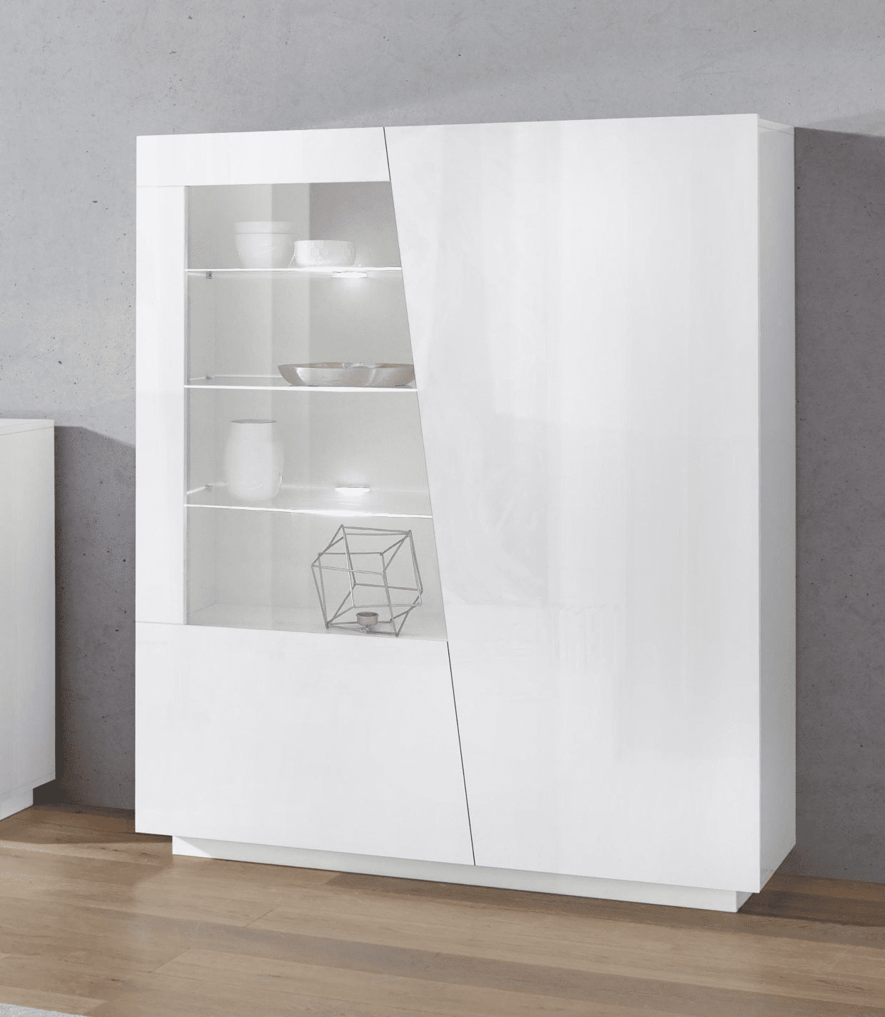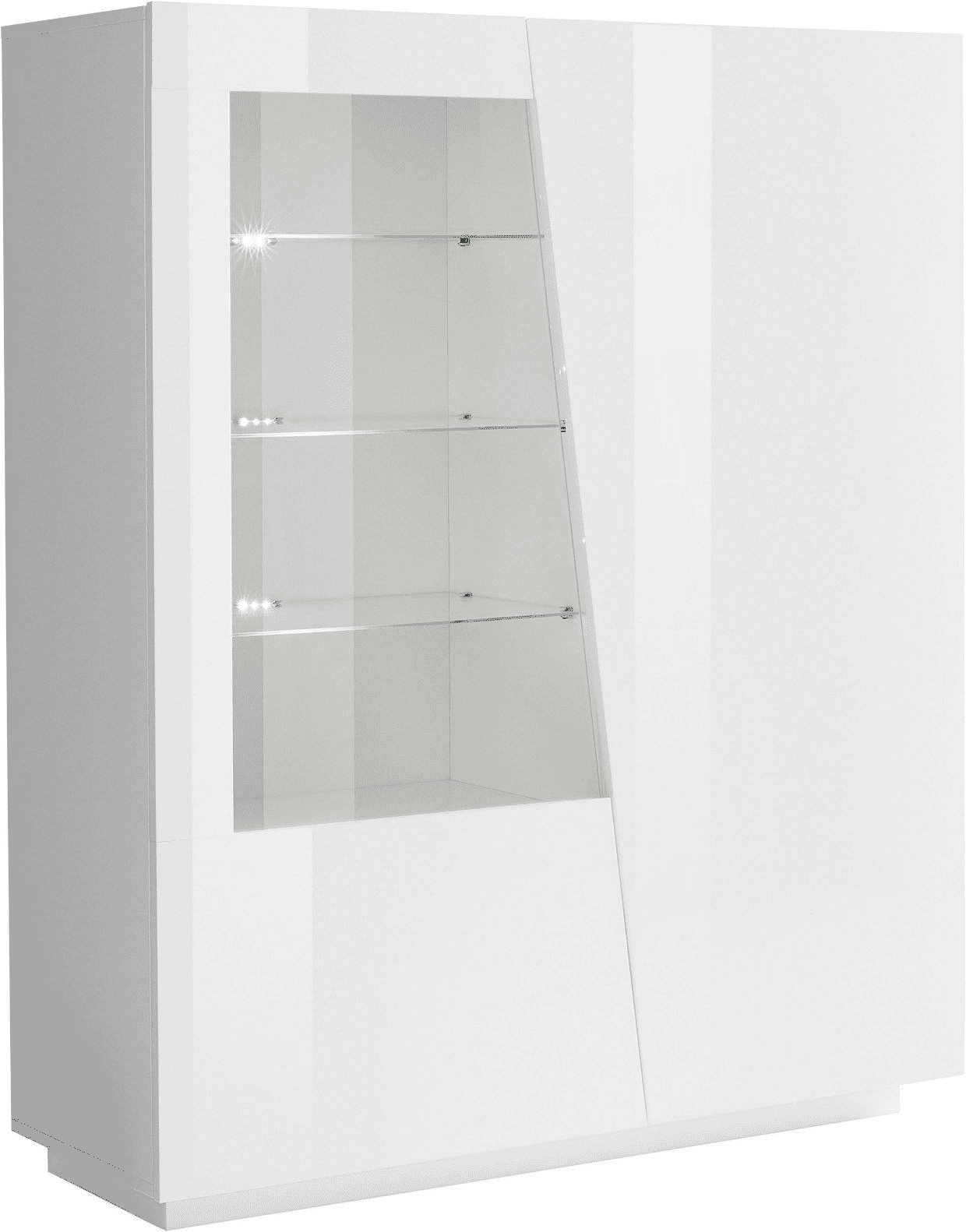 La vetrina VEGA è costituita da 2 ante battenti con il taglio in diagonale di cui una riquadrata con vetro.